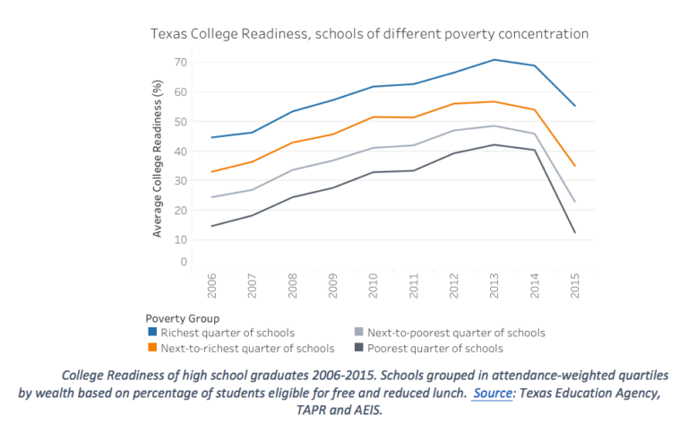 Texas began reporting college readiness of high school graduates for the year 2006, after legislation required “… the measure of progress toward preparation for postsecondary success.” It rose year after year until it reached a peak for the class of 2014. Then it plummeted, undoing a decade of progress. For graduates from the quarter of schools with the lowest concentration of low-income students, college readiness fell from 71 percent to 55 percent. For graduates from the quarter of schools where poverty is most highly concentrated, college readiness dropped from 42 percent to 13 percent. Hopes to increase the fraction of Texas youth who complete college degrees or post-secondary certificates are being dashed.