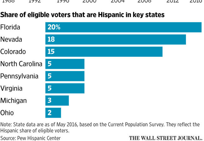 “The electorate is only getting more diverse,” said Florida-based Democratic strategist Steve Schale, who worked on Mr. Obama’s 2008 and 2012 campaigns. “If Clinton keeps the relatively anemic level of white support that Barack Obama got in 2012, Trump can only make up the difference by improving with Hispanics. Otherwise, there’s no path.”