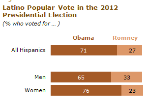 Latinos voted for President Barack Obama over Republican Mitt Romney by 71% to 27%, according to an analysis of exit polls by the Pew Hispanic Center, a Project of the Pew Research Center.1