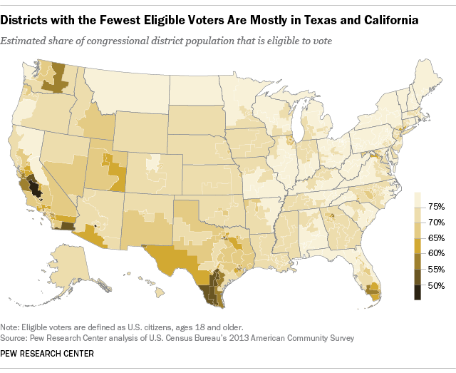 However, the appellants in the Texas case, Evenwel v. Abbott, argue that districts instead should be drawn to have equal numbers of eligible voters. (The case involves redistricting within states, not reapportioning congressional seats among states.)
