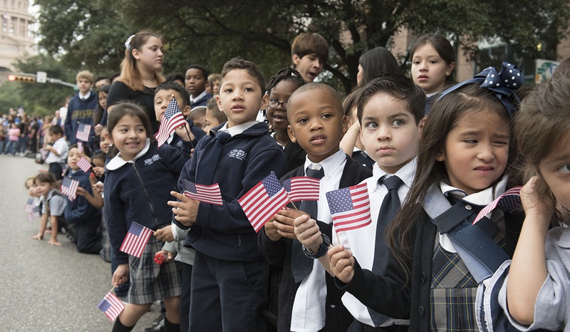Schoolchildren watch the Veterans Day parade on Congress Avenue in Austin on Nov. 11, 2015.
