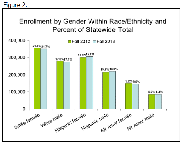 The conservative Texas Senate, led by Dan Patrick, is considering terminating the Dream Act signed by Gov. Perry. But that will add even more pressure for some Hispanics student to drop, or not enroll, due to high cost, and thereby increasing the “Gap” to enroll a total of 630,000 student by 2015; enrollment growth has slowed in recent years and fell by nearly 14,000 students in fall 2013. see figure 1