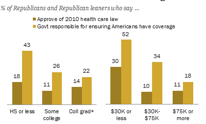 Among Democrats, three-quarters or more of those in all educational and income groups both approve of the Affordable Care Act and say ensuring health care coverage is a government responsibility.