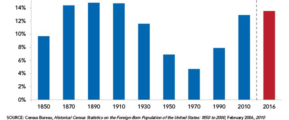 In 2016, the United States population of 323 million included 44 million foreign-born individuals, or roughly 14 percent. That percentage has varied throughout history. In 1970, for example, foreign-born individuals comprised only 5 percent of the total population. At other points in history, such as the late 1800s, the foreign-born population was much larger as a share of the total population.