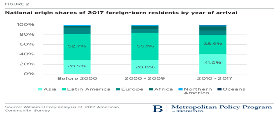 Many politicians—including President Donald Trump—suggest that the nation is being overwhelmed by less skilled immigrants from Mexico and the rest of Latin America, necessitating the government building a wall across the southern border. However, the U.S. Census Bureau’s American Community Survey numbers make plain that immigration from Latin America is slowing, as recent arrivals are coming from countries in Asia and are more prone than native-born Americans to obtain a college education. Moreover, these “21st century immigrants” are locating in parts of the country where immigrant concentration has been low, and in many states that supported Trump in the 2016 election.