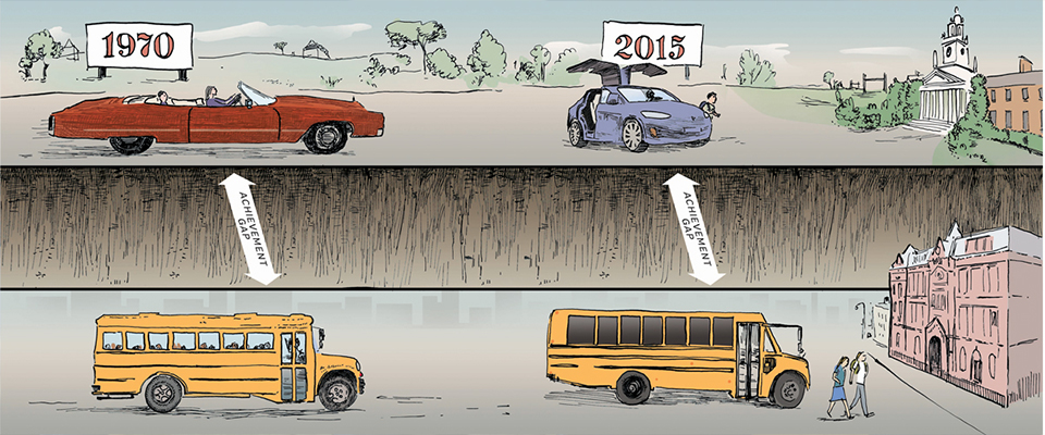 These analysts have good reason to express concern. National competitiveness is at stake, as education advocates have argued since the Soviet Sputnik launch inspired the National Defense Education Act of 1958. Economic productivity and growth are greater in countries where students perform better in math, reading, and science than in those that do not provide their youth the same opportunities to learn (see “Education and Economic Growth,” research, Spring 2008). And while some might see income inequality as the result of adult life choices about matters such as how hard to work or where to live, educational inequality seems unfair, because the economic status of a child is outside the child’s own control. It is an inequality of opportunity that runs counter to the American dream.