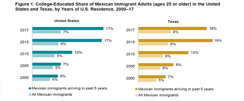 The number of Mexican immigrants in the United States with a bachelor’s degree or higher rose from 269,000 in 2000 to 678,000 in 2017. In Texas, a gateway state for Mexicans, the number increased from 61,000 to 185,000 over the same period. Only California, with 215,000 highly skilled Mexican immigrants, has a larger number.