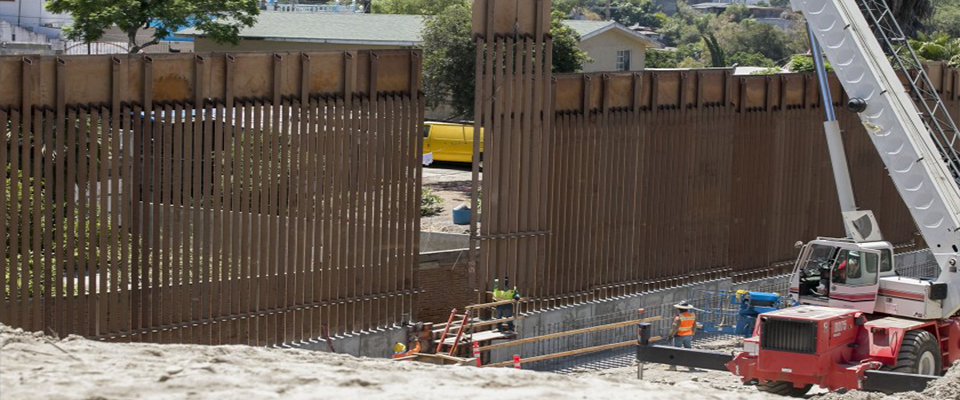 A construction crew installs the last panel of a section of new wall that replaced existing barriers just east of the San Ysidro Port of Entry. (John Gibbins / San Diego Union-Tribune)